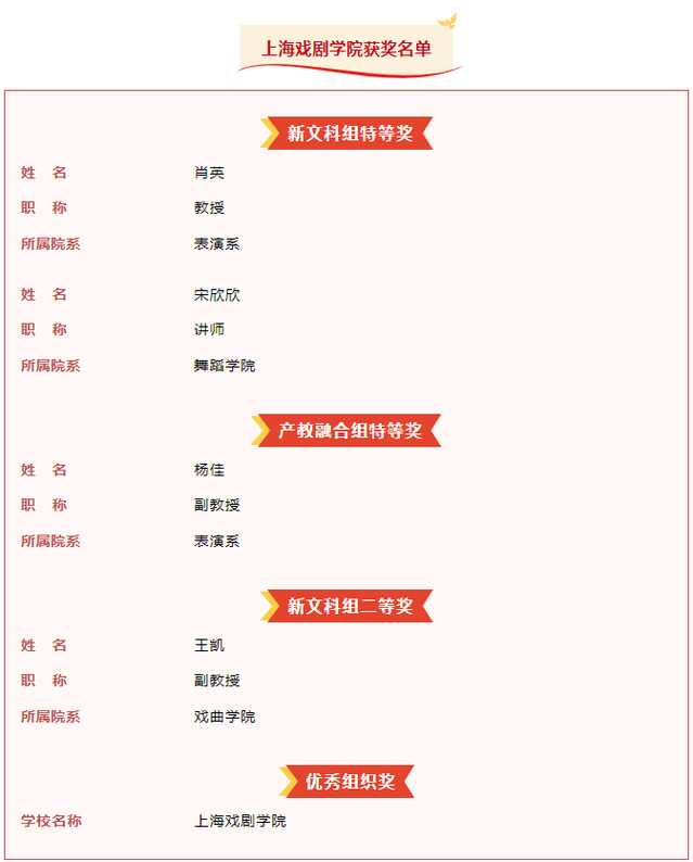 The Shanghai Theatre Academy won three grand prizes, one second prize, and an "Outstanding Organization Award." The number of grand prizes won by the academy accounted for three-fifths of those awarded to universities under the Shanghai municipality, ranking the first, and nearly one-sixth of the total awarded to universities in Shanghai, including those under the Shanghai municipality and those under the relevant ministries.